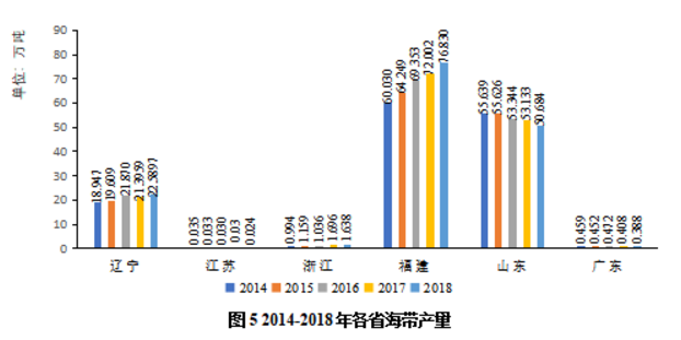 我國海帶主產(chǎn)區(qū)的三省分別是福建、山東和遼寧(圖5),其中福建作為海帶養(yǎng)殖最大的省份,近5年的海帶產(chǎn)量處于增長趨勢,平均每年增長6.40%,是全國海帶產(chǎn)量增長速度最快的省份,并且超過全國海帶產(chǎn)量增長的平均值。除福建之外,遼寧省近5年的海帶產(chǎn)量也處于增長趨勢,漲幅略小。而作為海帶生產(chǎn)第二大省的山東,近5年的海帶產(chǎn)量逐漸下滑,但仍然維持在50萬噸以上。對比之下,浙江、廣東和江蘇三省的海帶產(chǎn)量較小,每年海帶產(chǎn)量略有波動。