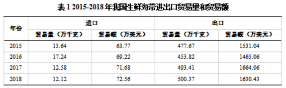 我國生鮮海帶的主要進口來源國為韓國和日本,2018年這兩個國家的進口量約占生鮮海帶進口總量的99%。主要出口目的國為日本、俄羅斯和美國,2018年對這三個國家的出口量生鮮海帶約為出口總額的80%。其中,2018年出口到日本的生鮮海帶最多,出口額為821萬美元(表1)。