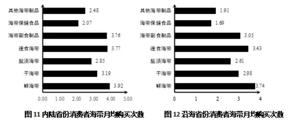 從總體上來看,不管是沿海省份的消費者還是內(nèi)陸省份的消費者,月平均購買3次以上的海帶品類都是鮮海帶、速食海帶、海帶副食制品。獨立樣本t檢驗的結(jié)果表明,沿海省份消費者月均購買鮮海帶3.74次,內(nèi)陸省份消費者月均購買鮮海帶3.92次,二者沒有顯著差異(p>0.05);沿海省份消費者月均購買速食海帶3.43次,內(nèi)陸省份消費者月均購買速食海帶3.77次,二者沒有顯著差異(p>0.05);但是內(nèi)陸省份消費者月均購買海帶副食制品3.76次,沿海省份消費者月均購買海帶副食制品3.05次,內(nèi)陸省份消費者的月均購買海帶副食制品的次數(shù)要顯著高于沿海省份消費者(p<0.001)。盡管內(nèi)陸省份消費者和沿海省份消費者在海帶保健制品的月均購買次數(shù)上都很少,但是相較于沿海省份消費者的月均購買1.69次,內(nèi)陸省份消費者的月均購買2.07次,要顯著更多(p<0.05)。以上結(jié)果表明,對于最受消費者青睞的鮮海帶和速食海帶,沿海省份消費者和內(nèi)陸省份消費者的消費頻率上是一樣(圖11-12)。