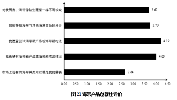 對于海帶產(chǎn)品的創(chuàng)新性的測量主要是讓受訪者對“市場上現(xiàn)有的海帶種類難以滿足我的需要”、“我希望有海帶新產(chǎn)品或海帶新吃法推出”、“我愿意嘗試海帶新產(chǎn)品或海帶新吃法”、“我能夠把海帶與其他海藻食品區(qū)分開”、“對我而言,海帶像陸生蔬菜一樣不可或缺”這些問題進行評分。其中,1代表非常不同意,2代表不同意,3代表中立,4代表同意,5代表非常同意。圖21展示了受訪者對各項具體指標評級的均值分布情況。