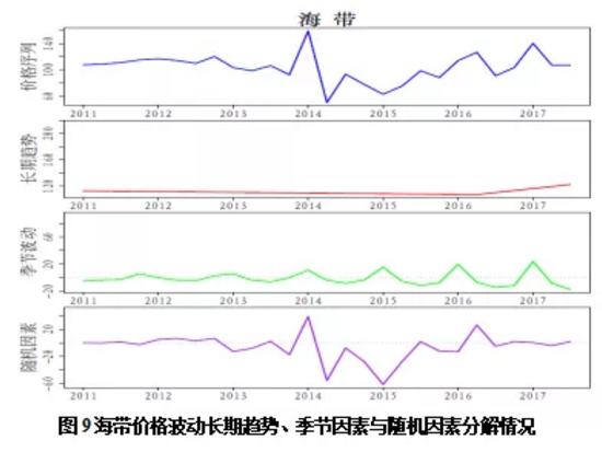 基于STL模型的海帶歷史價格波動分析結(jié)果顯示,2011年-2017年期間我國海帶價格呈現(xiàn)先小幅回落后波動上漲的趨勢,受氣候等因素影響2013年前后海帶波動劇烈。同時,我國海帶價格受長期趨勢和隨機因素的影響明顯,受季節(jié)波動影響較小。