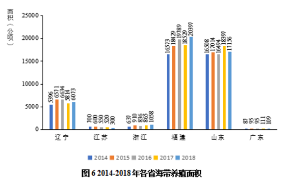 圖6表明2014年到2018年國內(nèi)主要海帶生產(chǎn)省份的海帶養(yǎng)殖面積也有所波動。福建和山東的海帶養(yǎng)殖面積波動較大,2014年-2016年,福建的海帶養(yǎng)殖面積逐漸增加,2016年,福建海帶養(yǎng)殖面積達到19789公頃,但到2017年福建的海帶養(yǎng)殖面積下滑近6.4%,但養(yǎng)殖面積的減少沒有影響福建的海帶產(chǎn)量,總體上福建作為全國海帶生產(chǎn)大省,海帶養(yǎng)殖面積逐漸增加,海帶產(chǎn)量也在增加。山東的海帶養(yǎng)殖面積在2014年到2018年間發(fā)生比較大的波動,總體養(yǎng)殖面積雖然有所增加,但是海帶產(chǎn)量在這5年間處于下滑趨勢,平均每年減產(chǎn)近1萬噸海帶。第三大海帶生產(chǎn)省遼寧的海帶養(yǎng)殖面積有所波動,但是遼寧的海帶產(chǎn)量沒有太大波動,處于穩(wěn)定增長的趨勢。江蘇省的海帶養(yǎng)殖面積逐年減少,隨之而來的導(dǎo)致江蘇省的海帶產(chǎn)量也逐年減少。浙江和廣東兩省的海帶養(yǎng)殖面積逐年增加,但總體上兩省的養(yǎng)殖面積較少,僅占全國養(yǎng)殖面積的2.6%。