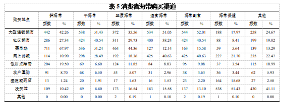 本次調(diào)查依據(jù)不同品類海帶的特點將消費者購買海帶的可能來源分為以下幾種形式:大型連鎖超市、社區(qū)超市、菜市場、網(wǎng)上商城、飯店直點、農(nóng)戶直購、醫(yī)院或藥店、沒買過或其他方式購買。
