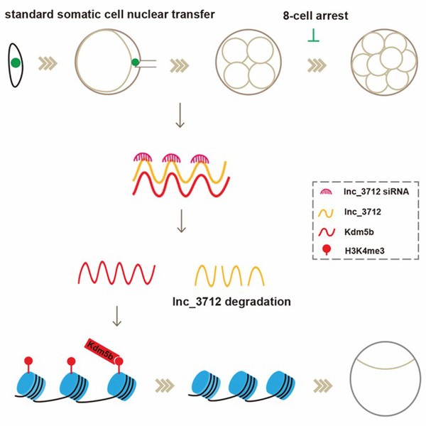 該研究以山羊組蛋白去甲基化酶Kdm5b為靶基因,鑒定到一條參與調(diào)控山羊克隆胚胎重編程的新lncRNA lnc_3712,闡明了lnc_3712與Kdm5b的調(diào)控方式,揭示了lnc_3712調(diào)控山羊克隆胚胎重編程的表觀遺傳機(jī)制,對(duì)于提高克隆胚胎發(fā)育能力和轉(zhuǎn)基因克隆動(dòng)物生產(chǎn)效率具有重要指導(dǎo)意義。