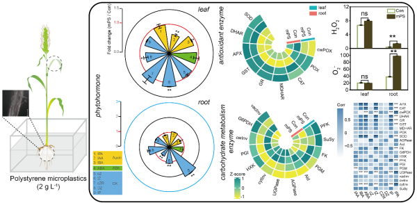 激光共聚焦顯微鏡觀察發(fā)現(xiàn),塑料微??梢员淮篼湼滴?。微塑料在根系中的積累導(dǎo)致根系H2O2和O2-含量升高。研究人員利用自主建立的歸一化酶組學(xué)分析發(fā)現(xiàn),微塑料顯著增加了大麥根中脫氫抗壞血酸還原酶、谷胱甘肽還原酶、ADP-葡萄糖焦磷酸化酶、果糖激酶、磷酸果糖激酶活性,降低了細(xì)胞壁過(guò)氧化物酶、液泡轉(zhuǎn)化酶、蔗糖合酶、磷酸葡萄糖變位酶、6-磷酸葡萄糖脫氫酶、磷酸葡萄糖異構(gòu)酶活性,而塑料微粒對(duì)葉片中的碳水化合物代謝酶活性及活性氧代謝酶活性的影響與根系中的表現(xiàn)不同。此外,微塑料導(dǎo)致大麥葉片中反式玉米素含量升高,而吲哚-3-乙酸、吲哚-3-丁酸、二氫玉米素含量降低。研究人員還發(fā)現(xiàn),碳水化合物代謝和活性氧代謝關(guān)鍵酶的變化與植物激素濃度具有顯著相關(guān)性。研究結(jié)果表明,塑料微??蓢?yán)重影響作物碳代謝過(guò)程和激素調(diào)控網(wǎng)絡(luò),對(duì)作物生長(zhǎng)發(fā)育產(chǎn)生直接影響。因此,未來(lái)研究中需更加重視塑料污染對(duì)作物生產(chǎn)的影響及其可能造成的生態(tài)安全問(wèn)題。