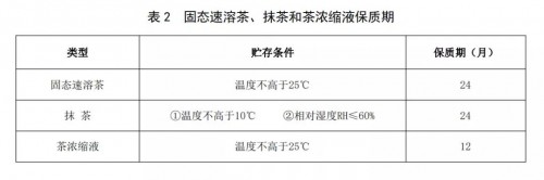 3.茶制品:我國(guó)的茶制品主要以固態(tài)速溶茶、抹茶和茶濃縮液為主,上述產(chǎn)品雖有產(chǎn)品標(biāo)準(zhǔn),但并未對(duì)產(chǎn)品保質(zhì)期進(jìn)行說(shuō)明,本次立項(xiàng)標(biāo)準(zhǔn)填補(bǔ)了保質(zhì)期標(biāo)準(zhǔn)的空白,規(guī)定了在采用鋁箔復(fù)合包裝(包材水蒸氣透過量宜<1.5 g/(m2·24h)、氧氣透過量宜<0.1cm3/(m2·24h·0.1MPa)下的貯存條件和保質(zhì)期,詳見表2: