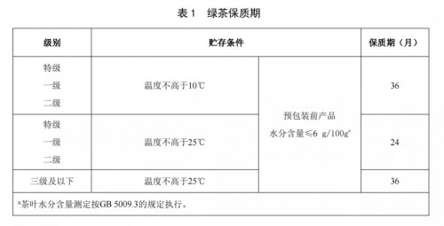 1.綠茶:在貯藏、運(yùn)輸、流通等過程中,受含水率及環(huán)境溫度、濕度、氧氣、光照等因素影響,其色澤、香氣、滋味等感官因子和營(yíng)養(yǎng)價(jià)值會(huì)隨著時(shí)間而下降,過去,針對(duì)綠茶保質(zhì)期的標(biāo)準(zhǔn)研究方面一直處于空白狀態(tài),本項(xiàng)標(biāo)準(zhǔn)通過綠茶貯藏保鮮系統(tǒng)研究,結(jié)合企業(yè)長(zhǎng)期生產(chǎn)實(shí)際,規(guī)定了預(yù)包裝綠茶產(chǎn)品在采用鋁箔復(fù)合包裝(包材水蒸氣透過量宜<1.5 g/(m2·24h)、氧氣透過量宜<0.1cm3/(m2·24h·0.1MPa)下的貯存條件和保質(zhì)期,詳見表1: