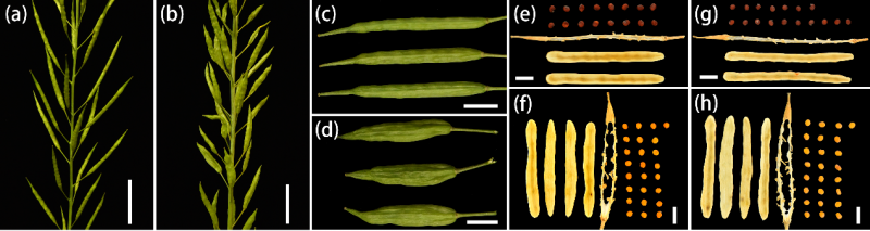 研究人員發(fā)現(xiàn),普通油菜的成熟角果是由2個角果皮組成,角果開裂后,其內部可見1個“I”型假隔膜把角果隔成2個果室,每個果室都有1排籽粒;而三室油菜的成熟角果是由4個角果皮組成,角果內部是由1個“II”型假隔膜隔成3個果室,中間的大果室含有2排籽粒,兩邊小果室各含有1排籽粒。三室角果的每角粒數(shù)較兩室角果顯著增多,具有潛在的增產效果。