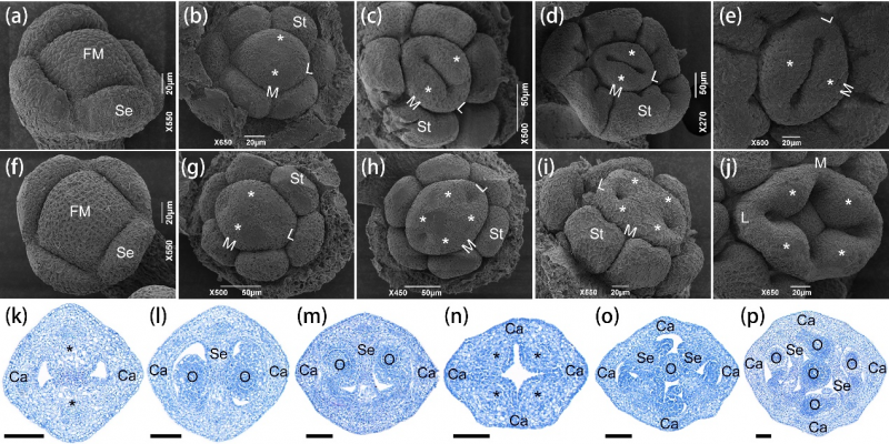 在全生育期比較這兩種油菜的表型差異,發(fā)現(xiàn)僅在花發(fā)育第5期(即心皮原基占據(jù)花分生組織)時,2個心皮原基的融合部位含有一個分生組織特性的組織,心皮邊緣分生組織(CMM),三室油菜的雌蕊CMM較兩室油菜膨大;隨后,含有膨大CMM的雌蕊發(fā)育形成三室角果。與CMM相比,其他分生組織未見差異。