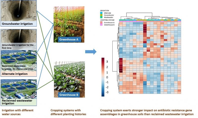 抗生素抗性基因(Antibiotic Resistance Genes,ARGs)廣泛存在于再生水中,因此,使用再生水灌溉是否會(huì)影響ARGs在土壤中的傳播擴(kuò)散備受關(guān)注。已有研究往往缺少嚴(yán)格對(duì)照,大多未考慮對(duì)作物的影響,同時(shí)缺少長期試驗(yàn)數(shù)據(jù)論證,且結(jié)論存在不一致現(xiàn)象。鑒于此,該團(tuán)隊(duì)利用宏基因組技術(shù),以具有16年再生水灌溉歷史且種植模式不同的兩個(gè)溫室土壤為研究對(duì)象,考察了再生水灌溉和種植模式對(duì)ARGs的影響。結(jié)果表明,各灌溉處理方式(地下水灌溉、再生水灌溉、地下水再生水交替灌溉)對(duì)土壤ARGs組成無顯著影響,而種植模式則顯著影響了ARGs、重金屬抗性基因、生物殺滅劑抗性基因、插入序列和微生物群落組成。研究結(jié)果為再生水的安全利用提供了理論依據(jù)。