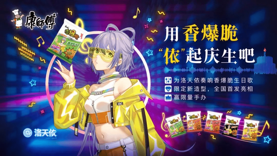 所以康師傅帶著洛天依的歌聲來了,在她九周年的生日會上,康師傅香爆脆引爆了洛天依的粉絲們。有一項調(diào)查顯示,全國擁有3.9億人正關(guān)注及對虛擬偶像有興趣,其中95-05年二次元用戶滲透率達64%,可見康師傅這一波的操作,影響了多少Z世代人群。