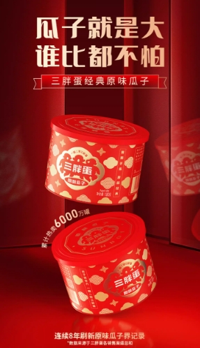 大瓜子,高人氣。三胖蛋堅守高品質(zhì)大瓜子13年,成為高端瓜子領導品牌,連續(xù)9年高端瓜子領域銷量遙遙領先。堅持用高品質(zhì)的三胖蛋大瓜子,復興中國休閑文化,為國人提供更高品質(zhì)的三胖蛋瓜子。