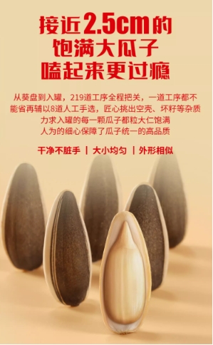 瓜子從葵盤到入罐足足經(jīng)歷了219道工序?qū)訉影殃P,歷經(jīng)8道人工手選,嚴格把控瓜的品質(zhì),挑選出空殼、壞籽等,平均籽粒長度接近2.5-3厘米,瓜子顆粒大仁飽滿。