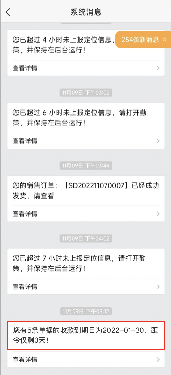 根據(jù)客戶結(jié)算方式,臨近單據(jù)的收款期限,系統(tǒng)會自動給業(yè)務(wù)員推送收款消息提醒。