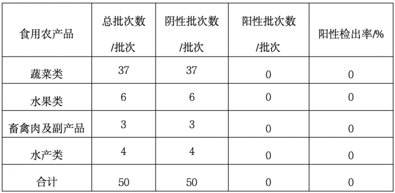 此次快檢活動(dòng),我們聚焦蔬菜、水果、畜禽肉及副產(chǎn)品、水產(chǎn)四大類(lèi)食用農(nóng)產(chǎn)品,共計(jì)抽樣50批次。具體結(jié)果如下: