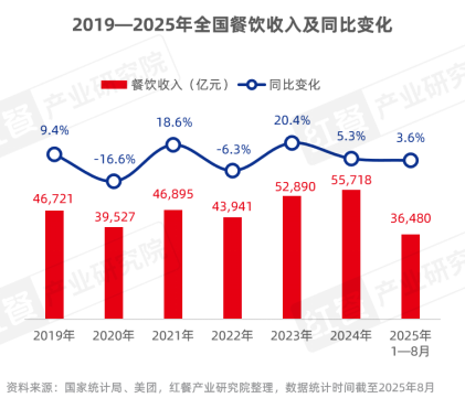 當(dāng)前,餐飲行業(yè)面臨增速放緩、存量激增、成本高企三重壓力。國(guó)家統(tǒng)計(jì)局?jǐn)?shù)據(jù)顯示,2025年1 - 8月全國(guó)餐飲收入3.6萬(wàn)億元,同比增長(zhǎng)3.6%,增速較2024年同期降3個(gè)百分點(diǎn),行業(yè)進(jìn)入低增長(zhǎng)周期。紅餐大數(shù)據(jù)顯示,截至2025年8月,全國(guó)餐飲門(mén)店超760萬(wàn)家,市場(chǎng)飽和度逼近臨界點(diǎn)。成本壓力持續(xù)加大,《2025年中國(guó)餐飲產(chǎn)業(yè)生態(tài)白皮書(shū)》指出,2024年第四季度餐飲服務(wù)員月均招聘薪酬達(dá)4806元,同比漲15.7%,廚師招聘薪酬同比漲幅達(dá)12.3%。同時(shí),消費(fèi)端收縮,全國(guó)餐飲大盤(pán)人均消費(fèi)降至36.6元,較2024年同期降7.7%,消費(fèi)者對(duì)“高性價(jià)比+優(yōu)質(zhì)體驗(yàn)”需求更強(qiáng)烈。