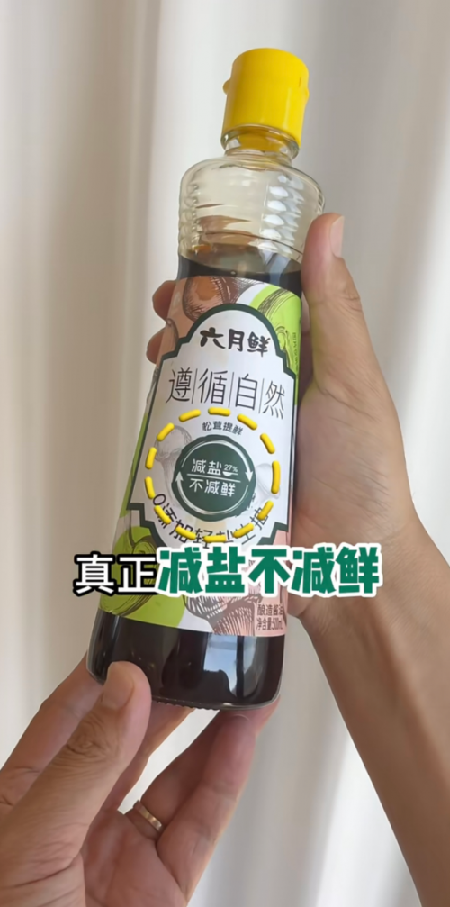 六月鮮遵循自然特級輕鹽生抽的配料表非常干凈,只含有六種天然食材:水、大豆、小麥、鹽、松茸、羅漢果。沒有味精、沒有人工防腐劑,也不含人工代糖。松茸本身帶有天然鮮香,用來替代味精,羅漢果濃縮汁則帶來自然回甘,既能提鮮又讓口味更溫和。每10克醬油的鈉含量為510毫克,比普通醬油大約低了三分之一,在保證鮮香口感的同時,有效幫助全家人減少鈉攝入。