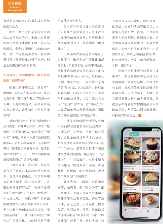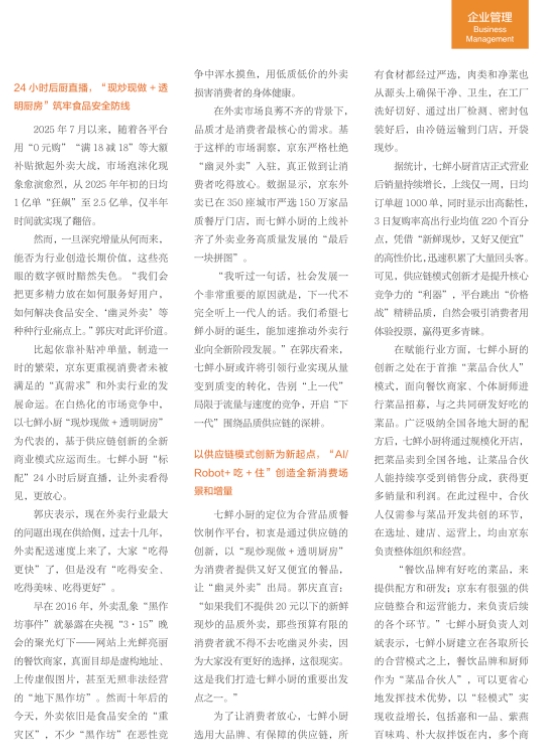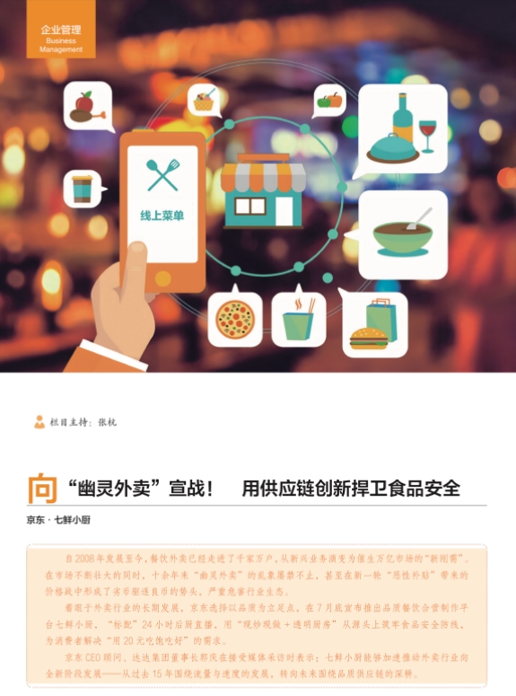 日前,京東七鮮小廚的創(chuàng)新模式獲《中國食品安全》雜志報道。作為市場監(jiān)管總局(國務院食安辦)主管、中國質(zhì)量標準出版?zhèn)髅接邢薰荆ㄖ袊鴺藴食霭嫔纾┲鬓k的月刊,本期發(fā)表的文章中指出,七鮮小廚有望重塑外賣行業(yè)的發(fā)展邏輯,引導行業(yè)從過去15年圍繞流量與速度的發(fā)展,轉(zhuǎn)向圍繞品質(zhì)供應鏈的深耕,與商家共同構(gòu)建健康、可持續(xù)的外賣生態(tài)。