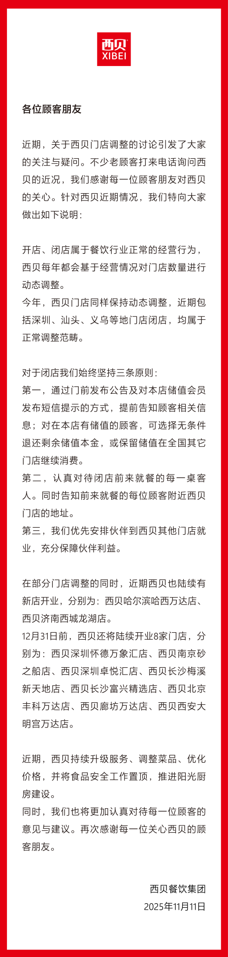 西貝辟謠:門(mén)店正常動(dòng)態(tài)調(diào)整,年底前再開(kāi)8家門(mén)店