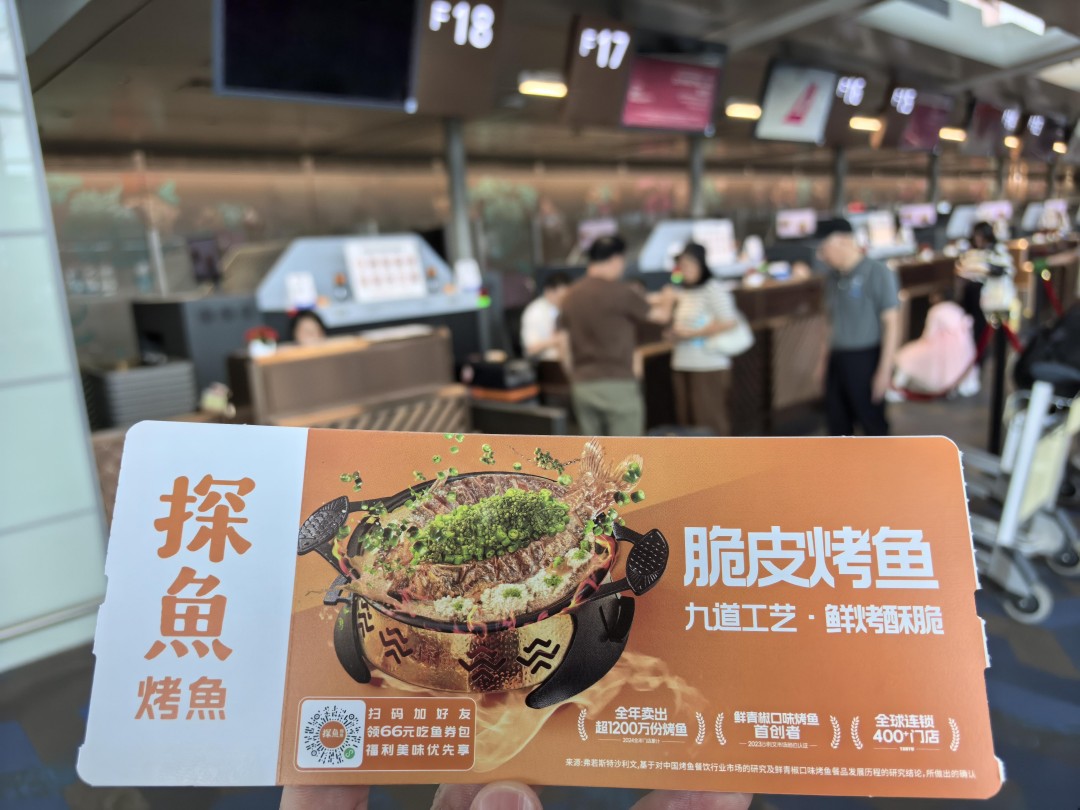 在國慶黃金周這一出行高峰期,無數(shù)旅客在登機(jī)時(shí)發(fā)現(xiàn),手中的東航登機(jī)牌上印有探魚烤魚的品牌信息。“九道工藝·鮮烤酥脆”這句宣傳口號(hào),從餐桌延伸至萬米高空,從區(qū)域性的餐飲消費(fèi)場景拓展至全國性的出行場景。