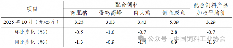 表2  2025年10月飼料企業(yè)配合飼料平均價格
