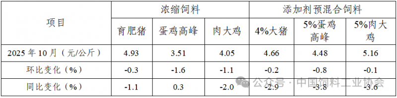 表3  2025年10月飼料企業(yè)濃縮飼料和添加劑預(yù)混合飼料平均價格