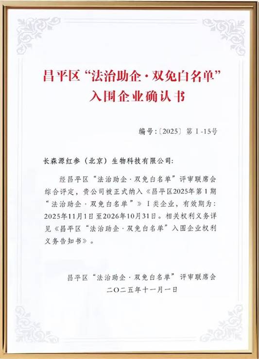 11月1日,經(jīng)北京市昌平區(qū)“法治助企·雙免白名單”評(píng)審聯(lián)席會(huì)嚴(yán)格審議與綜合評(píng)定,長森源紅參(北京)生物科技有限公司憑借較強(qiáng)綜合實(shí)力,被正式納入《昌平區(qū)2025年第1期“法治助企·雙免白名單”Ⅰ類企業(yè)》。這標(biāo)志著長森源在經(jīng)營穩(wěn)定性、商業(yè)信譽(yù)與合規(guī)水平方面獲得了政府與權(quán)威部門的高度認(rèn)可。