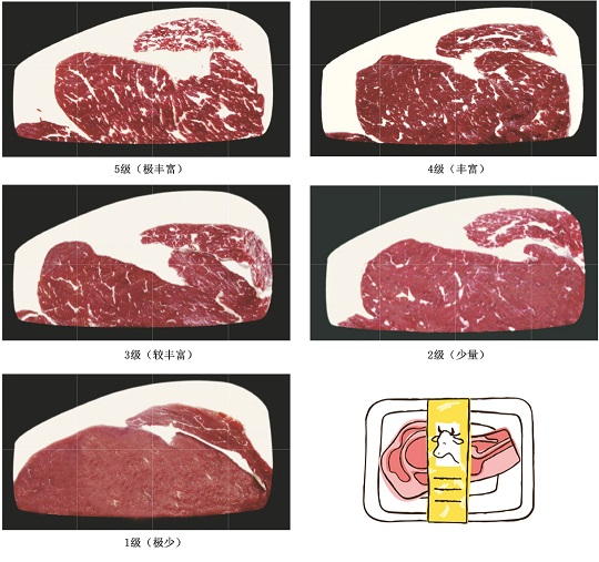 牛肉的大理石花紋從低到高分為1級(jí)、2級(jí)、3級(jí)、4級(jí)和5級(jí)。選取第6肋至第7肋間,或第12肋至第13肋間背最長(zhǎng)肌橫切面,觀察其大理石花紋豐富度,按照標(biāo)準(zhǔn)附錄A評(píng)定等級(jí)。