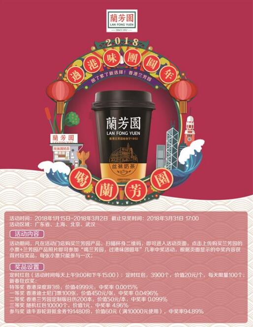 一杯香港蘭芳園奶茶足以掀起一陣味蕾上的狂歡,讓你在奶與茶的催化下精神抖擻地見證新一年的到來。除此,香港蘭芳園還帶來了新年大禮,只要你關注其官方賬號,加入它的“喝蘭芳園,過港味團圓年”H5主題活動,上傳線下購物小票就可參與抽獎。新年紅包、迪士尼門票等驚喜春節(jié)禮一定會助推你參與活動的熱情。拍照上傳,不費吹灰之力就可輕松與春節(jié)驚喜相擁,享受香港蘭芳園帶來的雙重快樂!