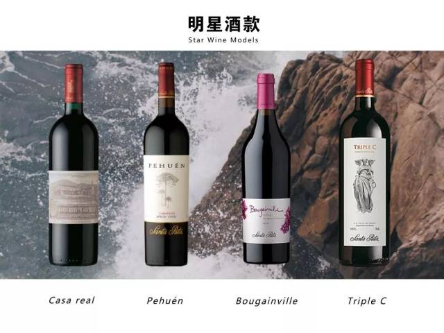 在圣麗塔酒莊旗下的品牌系列有:120、私家珍釀(Secret Reserve)、特釀(Reserva)、真實(shí)勛章(Medalla Real)、Floresta、南洋杉(Pehuen)、三麗人(Triple C)和 Bougainville。其頂級(jí)旗艦酒款為真實(shí)家園(Casa Real) 紅葡萄酒,在2013年獲得“傳奇葡萄酒”稱號(hào)。