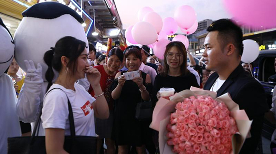 就在人們紛紛觀望的時(shí)候,一位小伙子手捧鮮花從車上下來(lái),小伙子的朋友也拿著氣球相繼下車,一起走向女孩。對(duì)此,“圍觀群眾”似乎有著一種默契,自動(dòng)為小伙子與女孩讓開(kāi)了一定的空間,只有1314茶的兩個(gè)人偶“默默地”陪在女孩身邊!
