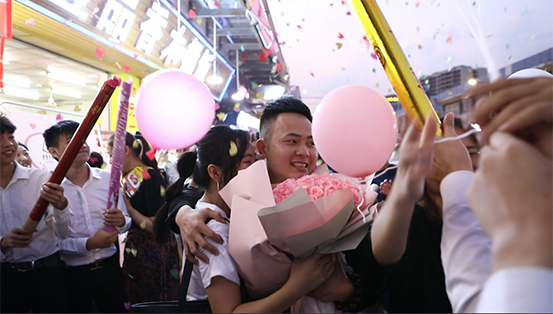 核心提示:5月20日,1314茶門前不時(shí)傳來(lái)歡呼聲,人們自發(fā)形成一個(gè)圍觀圈,高舉著手機(jī),見(jiàn)證那一刻的浪漫。人群中央,粉紅色的氣球下面,有