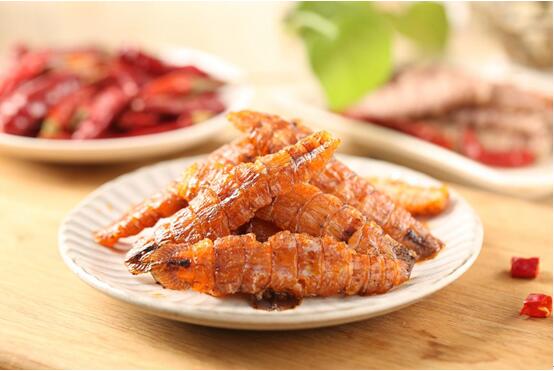 撕開藍色的包裝袋,一對“雙生子”般的蝦尾裹著鮮香的紅油,嚼起來Q彈又有韌勁兒。