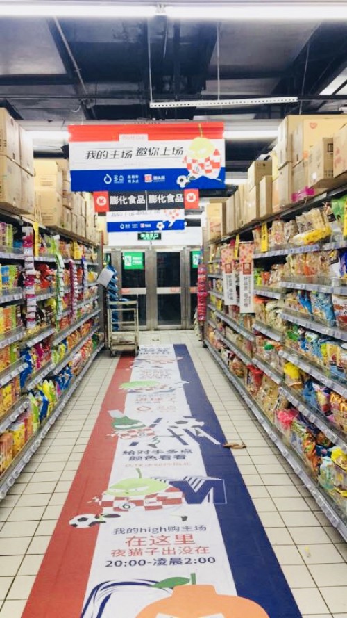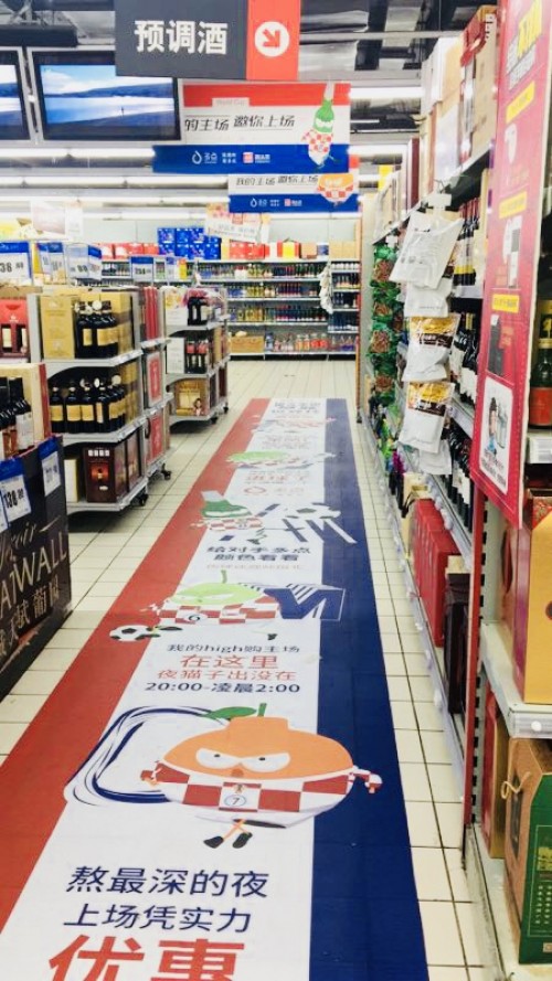 北京物美超市陶然亭店被打造為克羅地亞隊主題店,店鋪里滿滿都是代表克羅地亞的紅白格子元素。醒目的巨幅主題海報,色彩艷麗的活動地貼,主隊球衣、國旗、世界杯和足球等主題元素覆蓋全店,足球濃厚氛圍,令支持格子軍團的球迷大呼過癮。