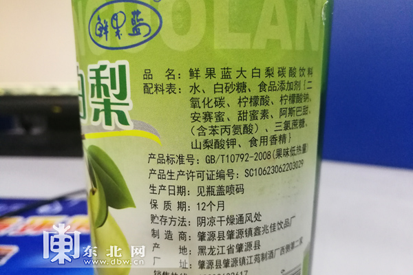 在肇源縣工業(yè)園區(qū)里,經(jīng)打聽,記者在一處大門緊閉且沒有文字牌匾(后來得知是肇源縣兆佳飲品有限公司,與肇源縣鑫兆佳飲品廠系一家)的灰色建筑物前停下,門衛(wèi)將記者領(lǐng)進產(chǎn)品展廳。記者在展廳里和展架上發(fā)現(xiàn)了鮮果藍(lán)大白梨及系列產(chǎn)品,廠址標(biāo)簽與劉女士提供大白梨地址一致。