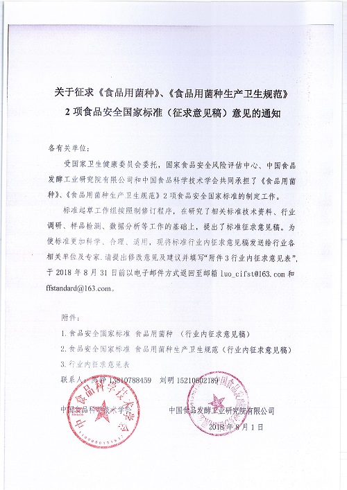 關(guān)于征求《食品用菌種》、《食品用菌種生產(chǎn)衛(wèi)生規(guī)范》 2項(xiàng)食品安全國(guó)家標(biāo)準(zhǔn)(征求意見(jiàn)稿)意見(jiàn)的通知