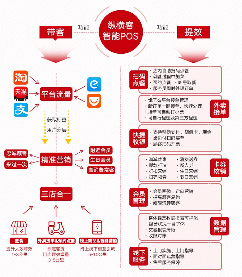 第一步“連接”:縱橫客智能POS連接口碑平臺,以此為入口為商家引流。