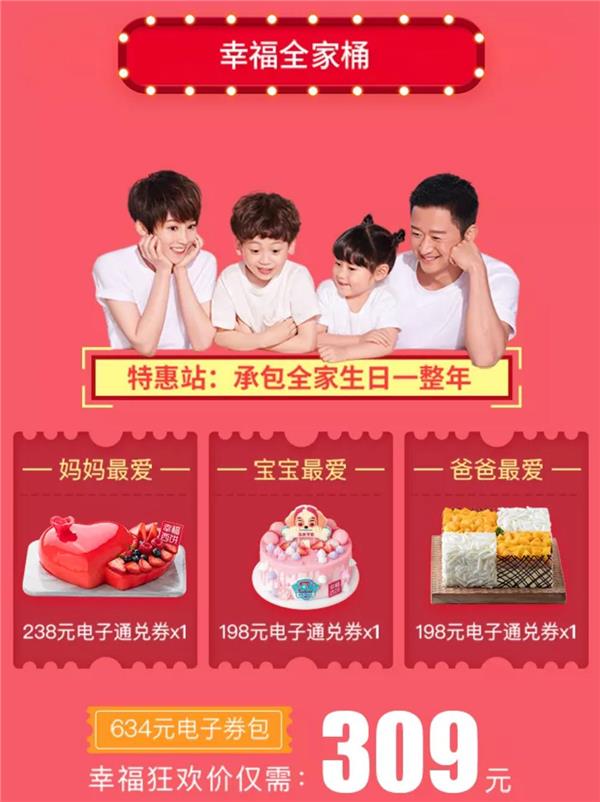 “幸福全家桶蛋糕套餐”,讓你一鍵搞定全家人一年的蛋糕!內(nèi)含238元蛋糕券1張,198元蛋糕券2張,總價值634元,現(xiàn)在4.87折僅需309元,精打細算,套餐更劃算。