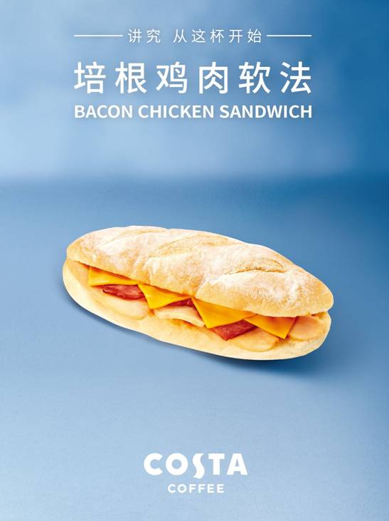 COSTA COFFEE的培根雞肉軟法只采用精選小麥粉,只為制作出松軟又有嚼勁的面包。高品質(zhì)煙熏雞肉和精肉培根的強(qiáng)強(qiáng)聯(lián)手,搭配秘制醬料和純正芝士片,層層疊加層層濃郁,每一口都是滿足與幸福。