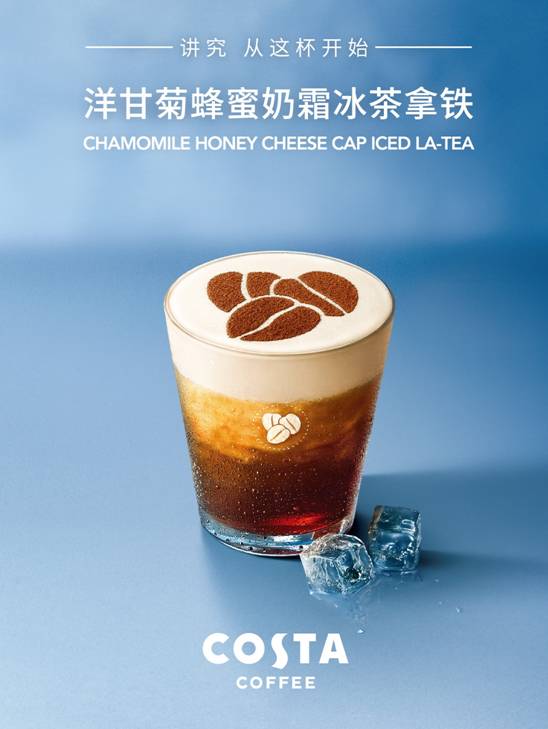 如果說洋甘菊蜂蜜茶拿鐵的出現(xiàn)是為晚秋增加了一絲暖意,那么其冰飲茶拿鐵則是給初秋減少了一絲暑氣。整杯飲品口感更為綿密,秘密武器是來自于COSTA COFFEE的輕咸甜芝士奶霜,帶來無厚重感的新鮮滋味,每一口都在制造驚喜。