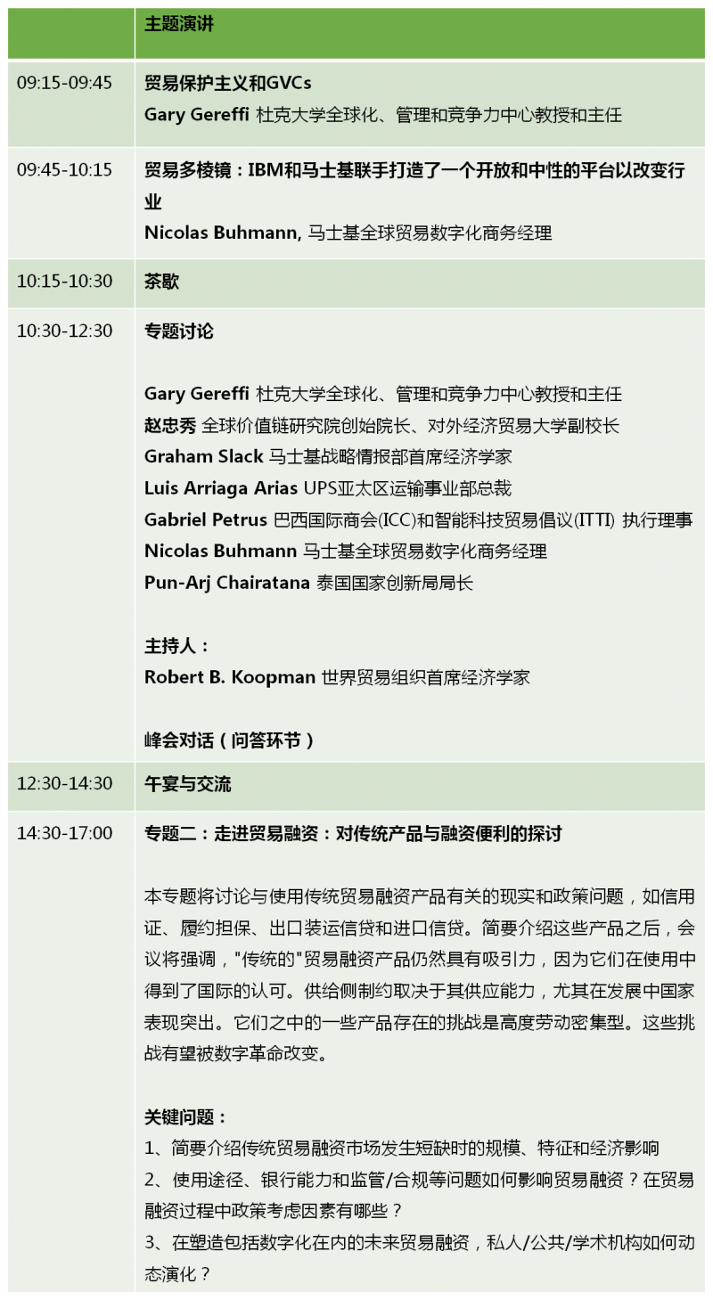 除了貿(mào)易融資專題之外,按照傳統(tǒng),峰會(huì)還將召開(kāi)一個(gè)關(guān)于全球經(jīng)濟(jì)和貿(mào)易總體狀況的專題,包括圍繞全球價(jià)值鏈產(chǎn)生的嶄新機(jī)遇以及潛在風(fēng)險(xiǎn)。此專題將重點(diǎn)關(guān)注今年貿(mào)易緊張局勢(shì)對(duì)GVCs已經(jīng)產(chǎn)生的和可能產(chǎn)生的影響; 以及技術(shù)創(chuàng)新帶來(lái)的GVC升級(jí)。