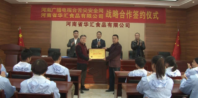 張國運總編輯與林建華董事長共同簽署了《舌尖安全網(wǎng)·河南省華匯有限公司戰(zhàn)略合作協(xié)議》。李天宇副總編輯向總經(jīng)理劉廣偉頒發(fā)了“戰(zhàn)略合作單位”匾牌。