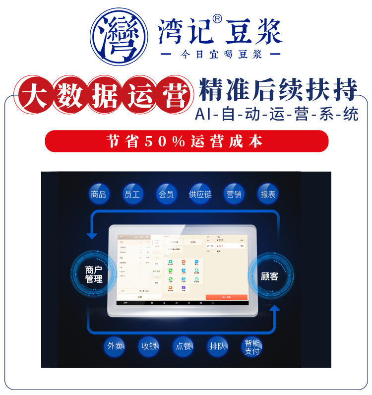 為提高店鋪運作效率,節(jié)省店鋪運營成本,灣記豆?jié){引入AI店鋪運營系統(tǒng),通過掃二維碼一鍵點餐、結(jié)賬,不僅提高了點餐效率,更節(jié)省了60%人工成本,再者,可利用運營系統(tǒng)掌控銷售報表、菜單管理、桌位管理、會員管理、員工業(yè)績、顧客反饋等運營大數(shù)據(jù),根據(jù)數(shù)據(jù)分析,做出精準調(diào)整,節(jié)省店鋪運營成本高達50%。此外,灣記豆?jié){已和多家外賣平臺達成戰(zhàn)略合作,依托成熟的外賣系統(tǒng)和大數(shù)據(jù)運營支持,灣記豆?jié){實體店收入可額外增收40%。