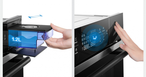 而濕度的調控,主要靠蒸烤一體機的蒸汽動態(tài)平衡技術以及外置1.2L觸控水箱來實現(xiàn),蒸汽動態(tài)平衡技術能夠有效減少冷凝水回滴,同時外置水箱使用戶在烹飪中途加水不用打開箱門,更加安全和方便。