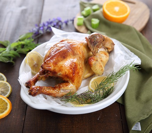 烹飪完成后,取出烤盤,烤雞焦黃的顏色看著就讓人食欲大增。趁熱用手撕著吃,淡淡的檸香伴著嫩滑的雞肉,讓吃的人幸福感直線上升。