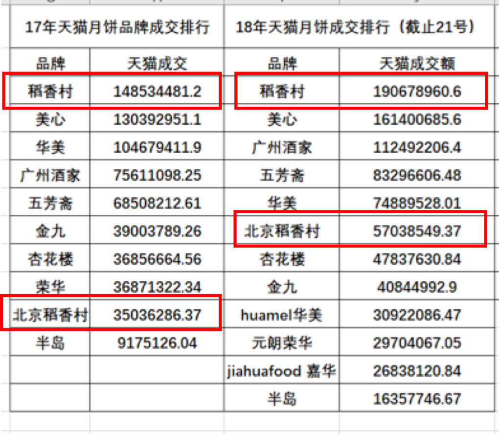 ▲蘇稻與北稻在2017-2018年天貓月餅品牌成交排行中名次對比