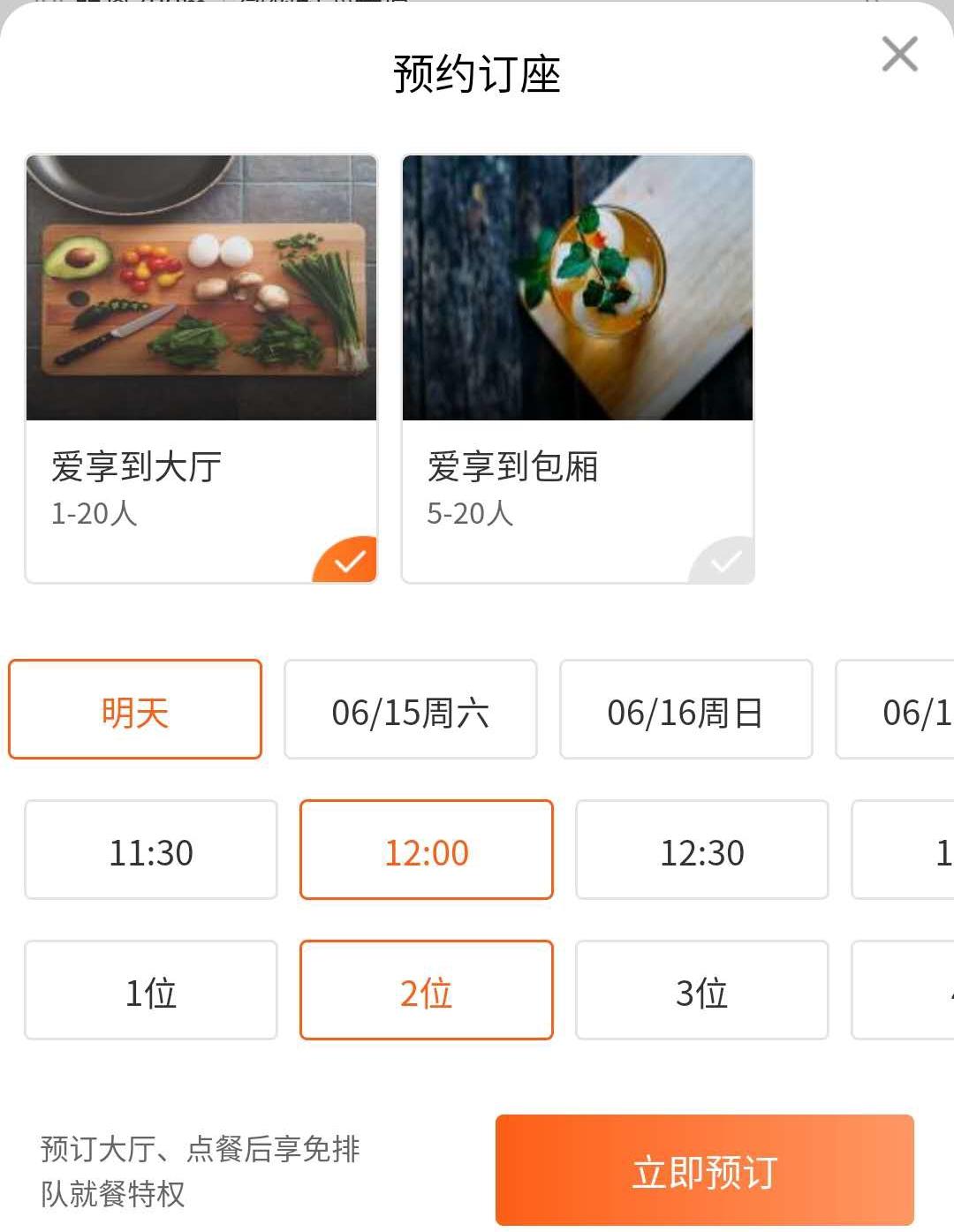 打開愛享到APP首頁(yè),挑選心儀的餐廳,選中餐廳預(yù)約時(shí)間后,選擇預(yù)訂大廳或者包廂、就餐時(shí)間和就餐人數(shù),就能預(yù)訂成功了。通過愛享到美食APP預(yù)訂的顧客,可以享受專屬會(huì)員折扣,讓用戶得到實(shí)實(shí)在在的優(yōu)惠。