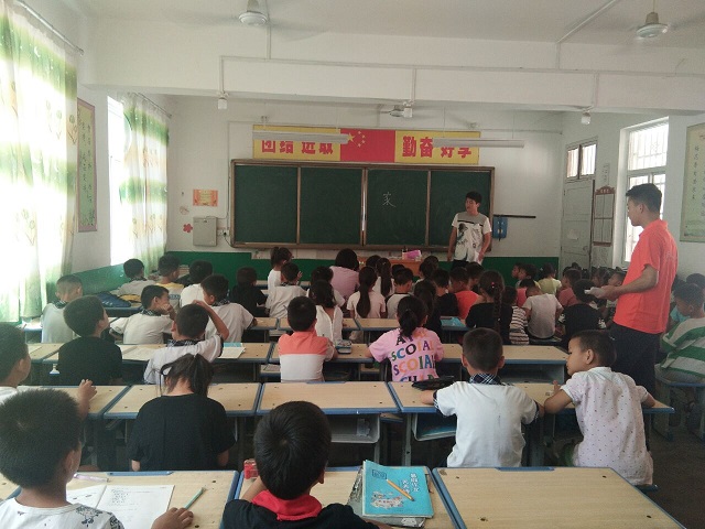 雖然烈日炎炎,學(xué)校教室制冷設(shè)備較少,但是華水博遠(yuǎn)支教團(tuán)的隊(duì)員們依然再堅(jiān)持著,他們的熱情非但沒有減弱,甚至更加沸騰。下午是從15點(diǎn)到16點(diǎn)10分開始上課,故事小組給學(xué)生們講了勵(lì)志的故事。除了剛開始上課點(diǎn)名的時(shí)候,課堂秩序有點(diǎn)亂,但一聽到支教團(tuán)講的故事,學(xué)生們很快被吸引了,像一個(gè)個(gè)的小精靈。16點(diǎn)20到17點(diǎn)30由體育組為他們上了體育課,隊(duì)員們先帶領(lǐng)孩子們做了一下熱身動(dòng)作,之后因材施教,對(duì)女生采取啦啦操教學(xué)。男生則學(xué)了軍體拳。孩子們都很積極的學(xué)習(xí)。整個(gè)操場上不僅揮灑著他們的汗水,更是洋溢著他們青春的笑臉。這個(gè)年齡的他們是最美的,也是最無憂無慮的。
