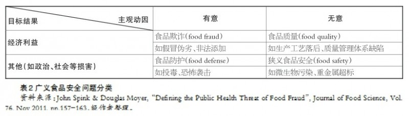 表2廣義食品安全問題分類  資料來(lái)源:John Spink & Douglas Moyer,“Defining the Public Health Threat of Food Fraud”, Journal of Food Science, Vol. 76, Nov 2011, pp.157-163,經(jīng)作者整理。