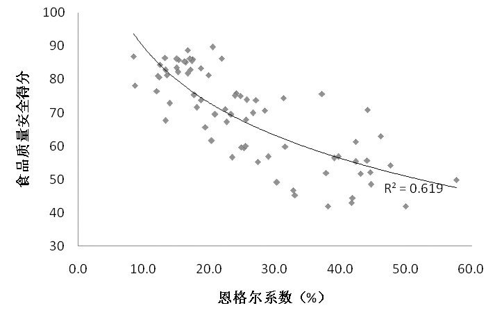 圖1 全球主要國(guó)家(地區(qū))消費(fèi)結(jié)構(gòu)與食品安全狀況關(guān)聯(lián)度(2015年)資料來(lái)源:恩格爾系數(shù)數(shù)據(jù)來(lái)自美國(guó)農(nóng)業(yè)部網(wǎng)站,http: //www.ers.usda.gov/data-products/food-expenditures.aspx;食品質(zhì)量和安全狀況得分來(lái)自上述英國(guó)《經(jīng)濟(jì)學(xué)人》雜志網(wǎng)站。數(shù)據(jù)經(jīng)作者整理。